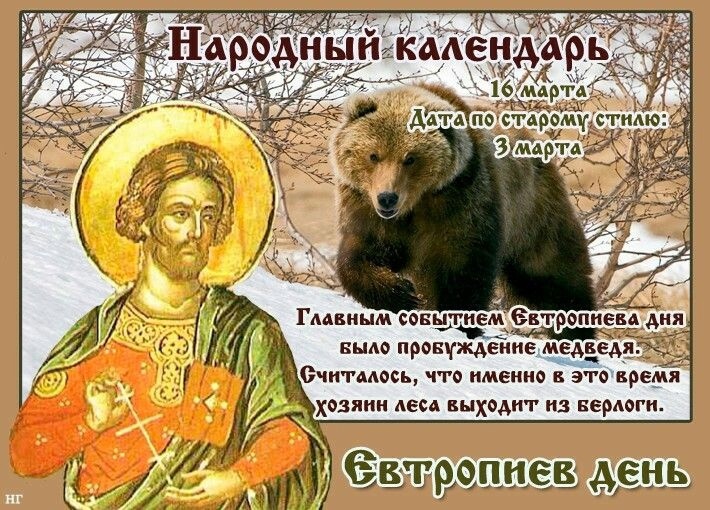 Этот день в православной традиции посвящен памяти мученика Евтропия Амасийского, жившего в III–IV веках в Малой Азии. Святой Евтропий прославился своей непоколебимой верой: несмотря на пытки и уговоры правителя Асклипиодота, он отказался отречься от христианства. По легенде, во время его мучений явился сам Господь, что потрясло всех присутствующих. Однако правитель, опасаясь народного возмущения, приказал казнить Евтропия и его сподвижников. Традиции и обряды В народе день Евтропия связывали с поговоркой: «Евтропий путь торопит да снег топит». Крестьяне в этот день обходили поля крест-накрест, призывая солнце растопить снег и помочь земле подготовиться к весенним работам. Солнце в этот день считалось одновременно милостивым и грозным, поэтому с ним обращались с осторожностью. Например, после заката запрещалось выбрасывать мусор из дома, чтобы не навлечь бедность, а также давать в долг хлеб или деньги, чтобы не лишиться своего благополучия. Одним из главных событий Евтропиева дня считал