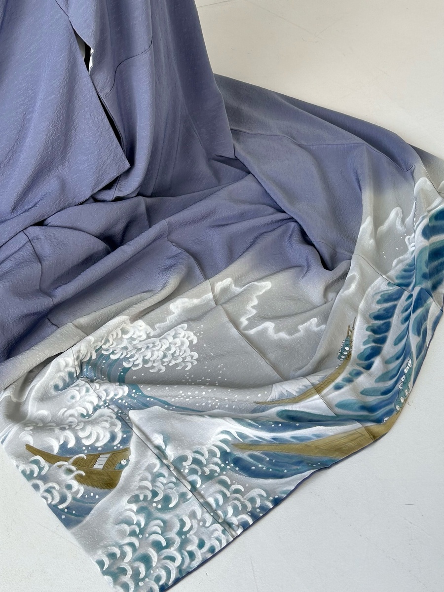 Японский шелковый креп тиримэн плотный и немного шероховатый наощупь. Его текстурная поверхность отлично подходит для крашения и ручной росписи, что делает тиримэн популярнейшим материалом для кимоно. Ткань красиво драпируется, образуя на одежде плавные складки, и благородно поблескивает на свету.