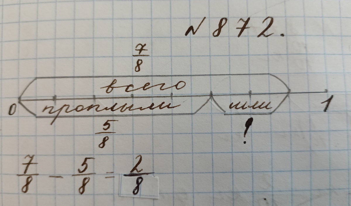 1. Проверка домашнего задания. 2. Актуализация знаний и объявление темы урока. - Как сложить дроби с одинаковыми знаменателями? (Нужно сложить только числители). Сегодня мы будем учиться вычитать дроби с одинаковым знаменателями. 3. Работа по теме урока. Откройте учебник на стр. 143. Найдите задание 872. Прочитайте. - Какую часть пути прошли туристы? (7/8). - Какую часть пути они проплыли? (5/8). - Какую часть пути они прошли? (Остальную). Сделаем чертеж к этой задаче. - Отрезок какой длины нам удобнее начертить? (8 см). Отметим часть всего пути туристов; часть, которую проплыли; часть, которую прошли. Весь отрезок обозначает целую единицу. Чтобы узнать, какую часть пути прошли туристы, нужно из всего пути вычесть часть, которую проплыли. Запишем выражение. - Сравните знаменатели дробей. (Они одинаковые). - Сравните числители. (Они разные). - Как вычитали дроби с одинаковым знаменателями? (Вычитали только числители). Запомните правило: При вычитании дробей с одинаковыми знаменателями в