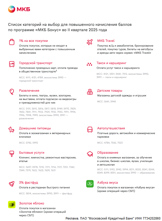 МКБ выложил категории кешбэк на второй квартал 2025г. Список категорий: 1% на все покупки МКБ Travel Городской транспорт МСС: 4111, 4131, 4789, экосистема 3990 Такси и каршеринг МСС: 4121, 3351-3441, 7512, экосистемы 3990, 3991 Образование МСС: 5111, 5192, 5942, 5994, 8211, 8220, 8241, 8244, 8249, 8299, 8351, 3990 Развлечения МСС: 5131, 5815, 5816, 5817, 5818, 5949, 5970, 7829, 7832, 7841, 7911, 7922, 7929, 7932, 7933, 7991, 7994, 7996, 7998, 7999, экосистемы 3990 (Яндекс), 3991 (Сбер) Детские товары МСС: 5641, 5945 Домашние питомцы МСС: 0742, 5995 Автопутешествия МСС: 4784, 7542, 7523 Бытовые услуги МСС: 5697, 5978, 7210, 7211, 7216, 7217, 7251, 7342, 7349, 7379, 7622, 7623, 7629, 7631 Фастфуд МСС: 5814, экосистемы 3990, 3991 Азбука вкуса (кроме операций через СБП) Золотое Яблоко (кроме операций через СБП) Специальные категории начисления баллов: Аптека и оптика (Доступно держателям карт «Пенсионная карта Мудрость») Кафе и рестораны ( МКБ -Премиум) ЦУМ (МКБ-Премиум) ✅ Можно выбрать
