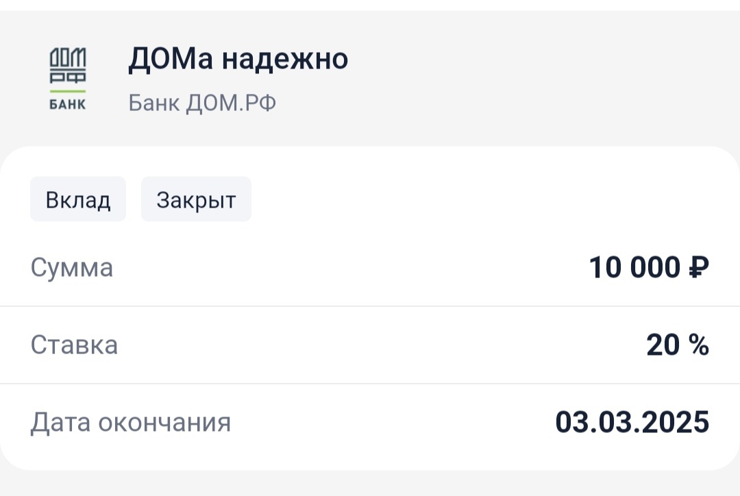 Изучив другие возможности получить бонусы, выбрала вариант с открытием вклада - за первый вклад начисляют 300 бонусов. Перешла в подборку и открыла вклад на минимальную сумму и минимально возможный срок: 10 000 ₽ на 31 день в Дом.РФ под 20%.