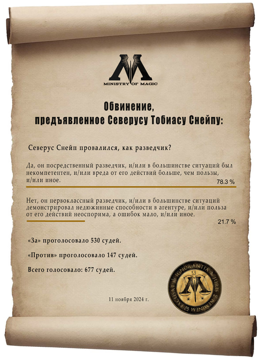 Доброго дня, уважаемый Визенгамот! Подытожим последнее заседание Визенгамота от 11.11.2024 года по девятому обвинению Северуса Снейпа. Напомню, что рассматривалась эффективность Снейпа в игре плаща и кинжала, его умение ориентироваться и принимать верные решения в непростых ситуациях и многое другое, проводящее грань между бестолковым и первоклассным разведчиком. Итак. Сильно ли шпионская деятельность Северуса Снейпа помогла светлой стороне? Или Пожирателям Смерти, пока Снейп был им предан душой и телом? Бездарный ли он разведчик? Или сам Джеймс Бонд поднимет бокал медовухи из золотых запасов мадам Розмерты в его честь?