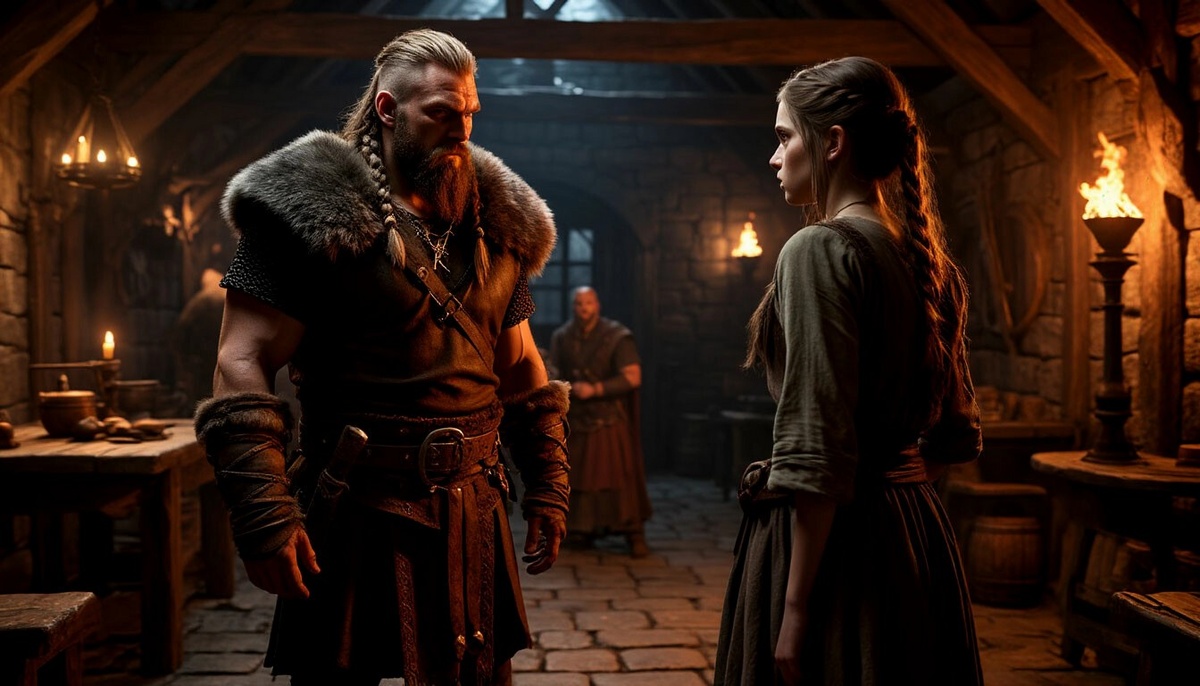 Вечером она совсем сбилась с ног. Сразу две команды собрались в общем доме. Еще и эти, в углу за дверью. Кто там сидел - было не понятно, а думать об этом ей было совсем некогда. Ингрид только сказала работать у них аккуратнее, и вообще больше почтения, да реже поднимать на них глаза. Так она и поступала - тихо, мышкой, отодвинув плечом тяжелую дверь, разносила им еду, да напитки. К слову сказать, эль они не пили. Видно, собрались тут по совсем серьезным делам. Оно и к лучшему - на нее не обращали внимания, сидели себе, негромко беседовали. Изредка, тот кто был ближе к выходу, высовывался и зло осаждал ватагу в общем зале, когда споры и пьяные бравые крики совсем досаждали. Вот только странность - там был еще один, наверное, тот самый кёниг, про него Инга вскользь сказала, еще днем. При каждом ее появлении у стола, тот замолкал и, казалось, разглядывал ее. Он сидел вдали, лицо было в тени, и зачем на нее смотрел, она так и не поняла. Вечер перешел половину, она как раз прибирала один и