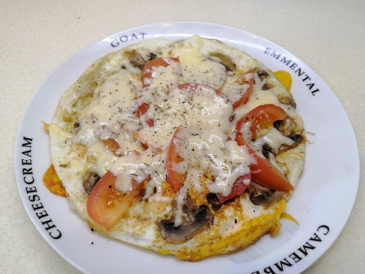 3. Накрыть крышкой и жарить до готовности яиц. Аккуратно перевернуть. Выложить нарезанные помидоры, чуть посолить, я посыпала итальянскими травами. Сверху выложила сыр. Накрыть крышкой и готовить на небольшом огне до расплавления сыра.