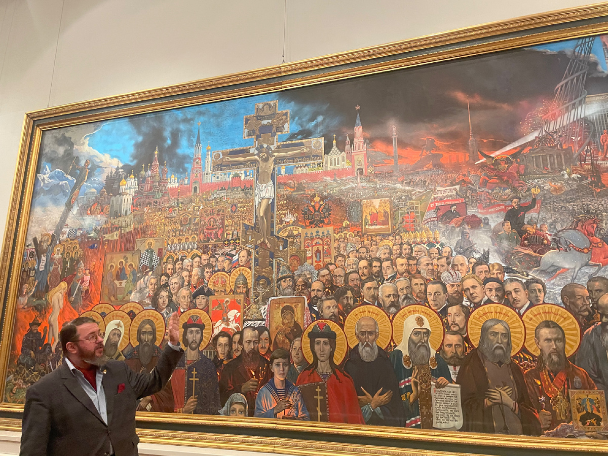 Экскурсию по залам музея, автором интерьеров которого был сам знаменитый художник, нам провел замечательный экскурсовод Сергей Терентьев. Он подробно рассказал о разных этапах жизни и творчества Ильи Сергеевича Глазунова, упомянул множество подробностей о его гигантских полотнах, особое внимание уделил необычным картинам с использованием вставок из тканей и камней, не обошел вниманием и его характерные иллюстрации к книгам Достоевского и других писателей. Вообще, очень понравилось как распределены работы художника по залам – все развешано четко по тематикам, очень легко найти интересный зал и все в нем тщательно осмотреть, ничего не упустив.