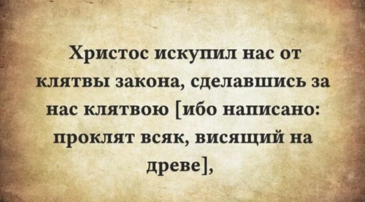 Послание к Галатам, глава 3, стих 13. Ибо написано: "Проклят всяк, висящий на древе" то есть всякий дух, живущий в плоти плотного человека. Ибо теперь мы живём не только в плоти плотного человека, а в человеческой душе, которая грешит вместо нас, если она живёт со своим духом в плоти человеческой. И если вы воскресили человеческую душу, то не оставляйте её долго на вольном бытии. Не давайте ей времени, чтобы она почувствовала и осознала себя самостоятельной сущностью. Ибо она сможет не только себя осознать таковой, но и осознать наше духовное присутствие в её бытии и в других людях. И проклят будет перед "богом" всякий тёмный дух, который долго не входит своей душой в плоть человеческую, а оставаясь в теле плотного человека, даёт своей душе осознать себя самостоятельной сущностью, которая может существовать вне человеческой плоти. И станет оно точно таким же, как бытие, которое мы вели по закону. Ибо стал этот закон бессилен после того, как Всевышний Творец Бог Свет явил во плоть че