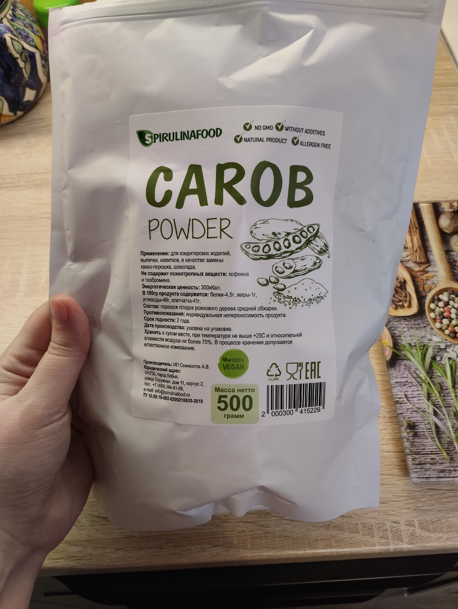 На самом деле я без понятия, сколько там протеина, но в оригинальном рецепте они назывались именно "протеиновые вафли". Я называю их "вафли с кэробом", так как для меня это самая главная их отличительная особенность. Их калорийность - 214 ккал на 100 грамм готовых вафель. О существовании этого продукта я узнала именно из этого рецепта. Теперь расскажу вам. Кэроб - это плод древовидного растения из семейства бобовых, обычно произрастающего в Средиземноморском регионе. Хотя кэроб низкокалориен, он обладает высокой белковой ценностью. Кэроб богат витаминами и минералами, такими как витамины, калий, кальций, железо и магний. По виду он напоминает какао. Но только по виду. Я пробовала заварить кэроб. Мне не понравилось. А вот вафли, как ни странно, понравились. Купила я его кстати вот в такой огромной упаковке. Заказывала я его на Вайлдберриз, как и овсяную крупу (не для этого рецепта). Так как в наших магазинах таких эксклюзивных товаров нет. Итак, для приготовления вафель нам понадобя