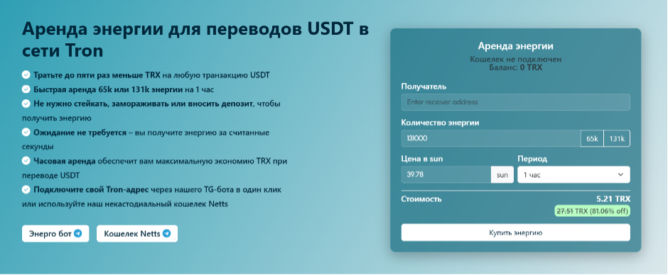 Конечно, NETTS – пока единственный сервис, который позволяет снизить расходы на перевод TRC-20 на 80%. Но рынок аренды Energy неуклонно развивается, поскольку идеально подходит тем, кто регулярно и часто отправляет USDT и другие токены TRC-20.