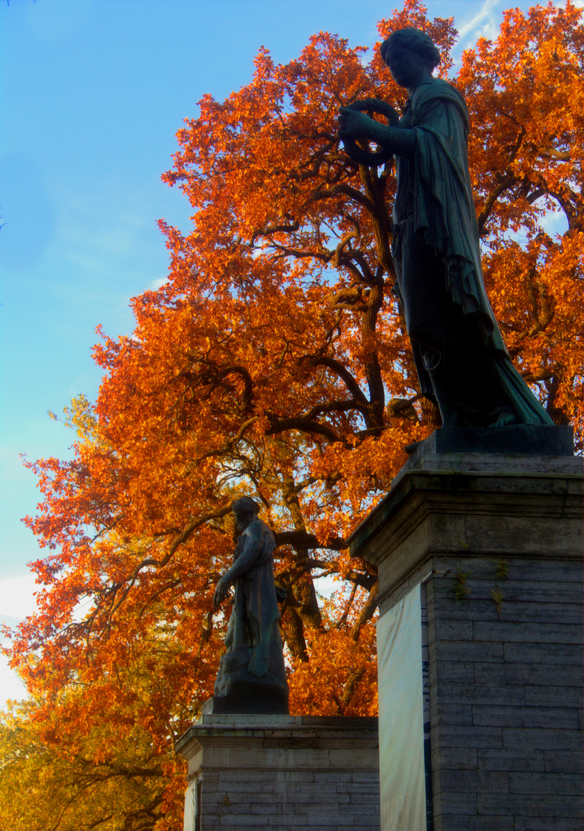 Яркие, пламенеющие краски, солнечное золото, сначала легкими нитями пронзающее зелень листвы, а затем поглощающее все и вся... Строгая медь дубов, оттеняющая ласковую желтизну прекрасных кленов...Кажется, природа в одночасье решила воплотить все стадии, все оттенки солнечного света: от улыбок первых желтых утренних лучиков, до роскошной бронзы заката....