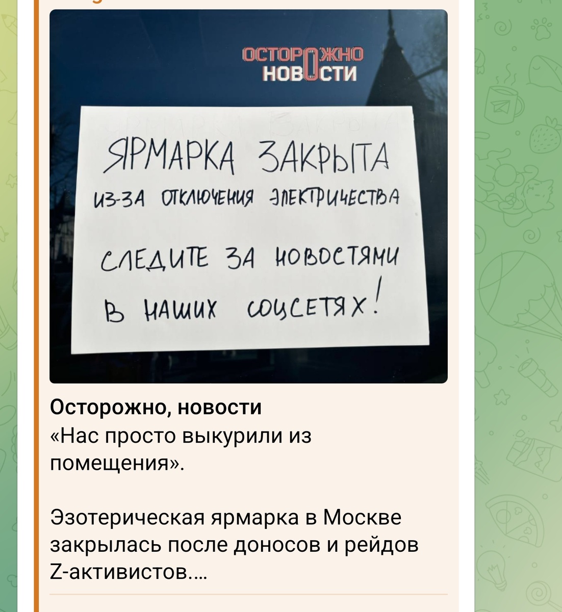 Приветствую всех в своем фейском гнезде! *вздыхает* Весь вечер вчера думала, как выразить свои мысли по поводу случившегося на маркете Волшебница. Потому, что с одной стороны оно так, а с другой эдак. Суть происшедшего: маркет Волшебница, на котором собраны консультанты с таро и прочим, самые разные рукодельные товары на околомагическую тему разогнали активисты СС- Сорок Сороков, религиозная организация, прикрывающаяся благими целями. Что произошло? Примерно 15 молодцев в камуфляже, вооружившись проф камерой- чтобы заснять эпический подвиг, устроили настоящий дебош. Хватали посетителей, докапывались с вопросами веры, доводя до слез людей, обзывали до мастеров. Вот моя подруга- торгует дредорезинками и заколками в виде черепов животных, докопались и до нее. А чего не идете в магазины охотников- там чучела и черепа настоящих животных! Пели песни, кричали кричалки, а общем, сорвали маркет. Была вызвана полиция, молодцы ушли. Но маркет больше не открылся- утром выяснилось, что в помещении