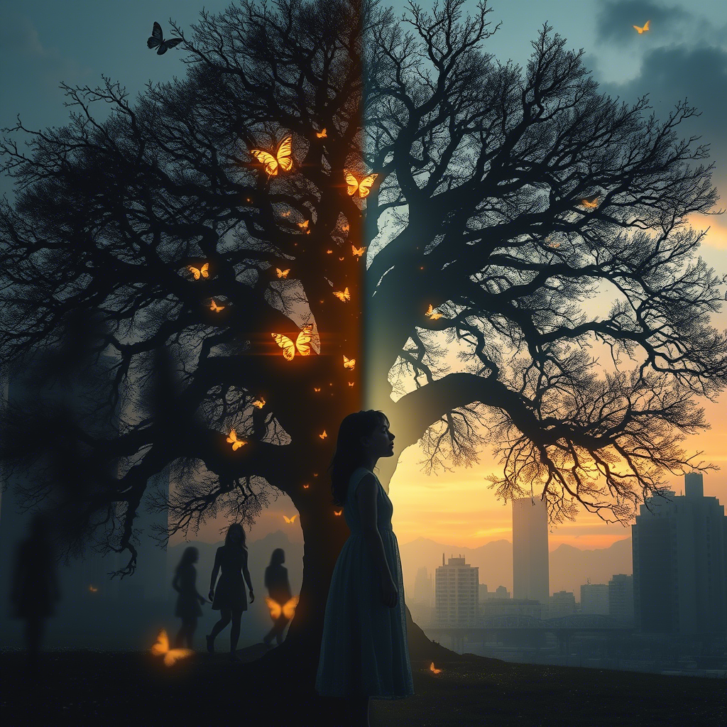 В одном городе, облаченном в серые тона, где низкие тучи, словно ленивые кошки, цеплялись за острые крыши домов, жила Девочка-Гроза. Каждый новый день становился для нее настоящим испытанием. Её жизнь била молниями: то начальник-ураган, с лицом, багровым от гнева, налетал с упрёками, словно штормовой фронт; то коллеги-сороки, с острыми языками и завистливыми взглядами, каркали за спиной, распуская сплетни и слухи. Даже случайные незнакомцы в переполненных автобусах толкались и стремились сбить с ног. А к вечеру от Девочки, измученной и опустошенной, оставалась лишь жалкая лужица усталости. “Почему я, словно бездонная губка, впитываю их гром и ярость?” – горько плакала она, сидя в своей маленькой комнате, но, собрав остатки сил, наутро снова поднималась на ноги и шла в бой, метая молнии в ответ, защищаясь от окружающего мира. Однажды, она спряталась от проливного дождя под сенью старого дуба. Сидя там, в тишине и укрытии, она вдруг услышала тихий, едва различимый шепот: — Ты кормишь тех