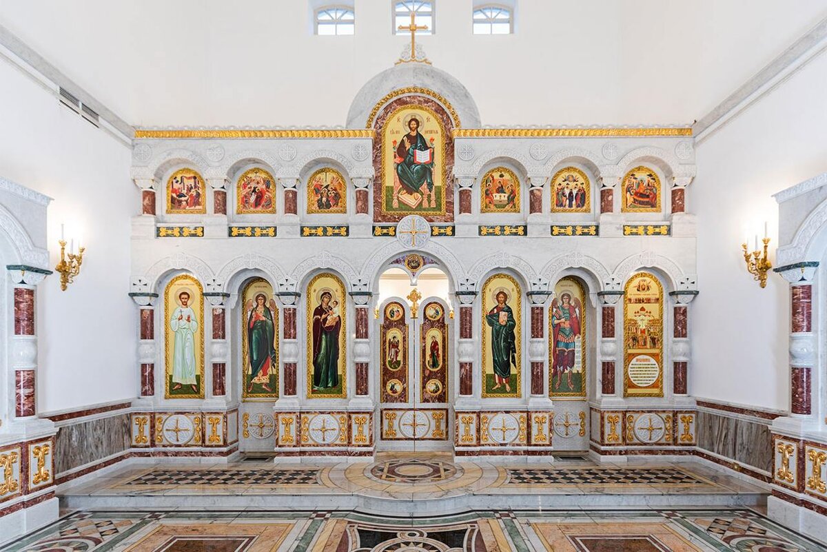 Выполнен в псевдорусском стиле из белого мрамора. Лаконичная резьба по мрамору акцентирует все внимание на иконах, а литые бронзовые элементы создают единство гармонии и подчеркивают торжественность богослужения. 2. Трехъярусное паникадило с вращающимся хоросом