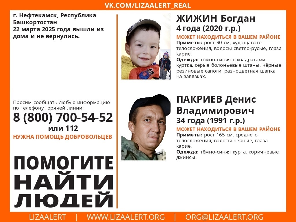 В Нефтекамске ищут пропавших 34-летнего Дениса Пакриева и четырехлетнего Богдана Жижина. Об этом сообщают волонтеры поискового отряда «Лизаалерт». 22 марта 2025 года они вышли из дома и не вернулись. Приметы мужчины: рост 165 см, среднего телосложения, волосы черные, глаза карие. Был одет: темно-синяя курта, коричневые джинсы. Приметы ребенка: рост 90 см, худощавый, волосы светло-русые, глаза карие. Был одет: темно-синяя с квадратами куртка, серые болоньевые штаны, черные резиновые сапоги, разноцветная шапка на завязках. Сообщить о местонахождении мужчины с ребенком можно по номерам: 112 или 8-800-700-54-52. СЕЙЧАС ЧИТАЮТ: Стали известны новые подробности про пропавшего мужчину с 4-летним ребенком