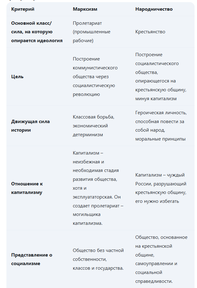 Важно отметить, что как марксизм, так и народничество представляли собой сложные и многогранные идеологии, и внутри каждого из этих течений существовали различные взгляды и подходы. Данное сравнение является лишь обобщением основных положений этих идеологий.