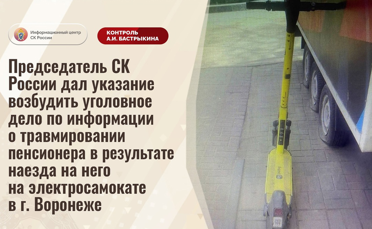 Председатель СК России дал указание возбудить уголовное дело по информации о травмировании пенсионера в результате наезда на него на электросамокате в г. Воронеже В телеграм-канале сообщается, что 21 марта текущего года в городе Воронеже водитель средства индивидуальной мобильности сбил пенсионера на тротуаре, после чего скрылся с места происшествия. Пострадавший доставлен в медицинское учреждение для оказания необходимой помощи. В региональном следственном управлении по данному факту организована процессуальная проверка. Председатель Следственного комитета Российской Федерации Александр Иванович Бастрыкин дал указание руководителю СУ СК России по Воронежской области Михаилу Алексеевичу Селюкову возбудить уголовное дело и представить доклад об установленных в ходе первоначальных следственных действий обстоятельствах, а по завершении расследования – о его результатах. Исполнение поручения поставлено на контроль в центральном аппарате ведомства. #СледственныйКомитет #СКРоссии #СКР #ИЦСКР