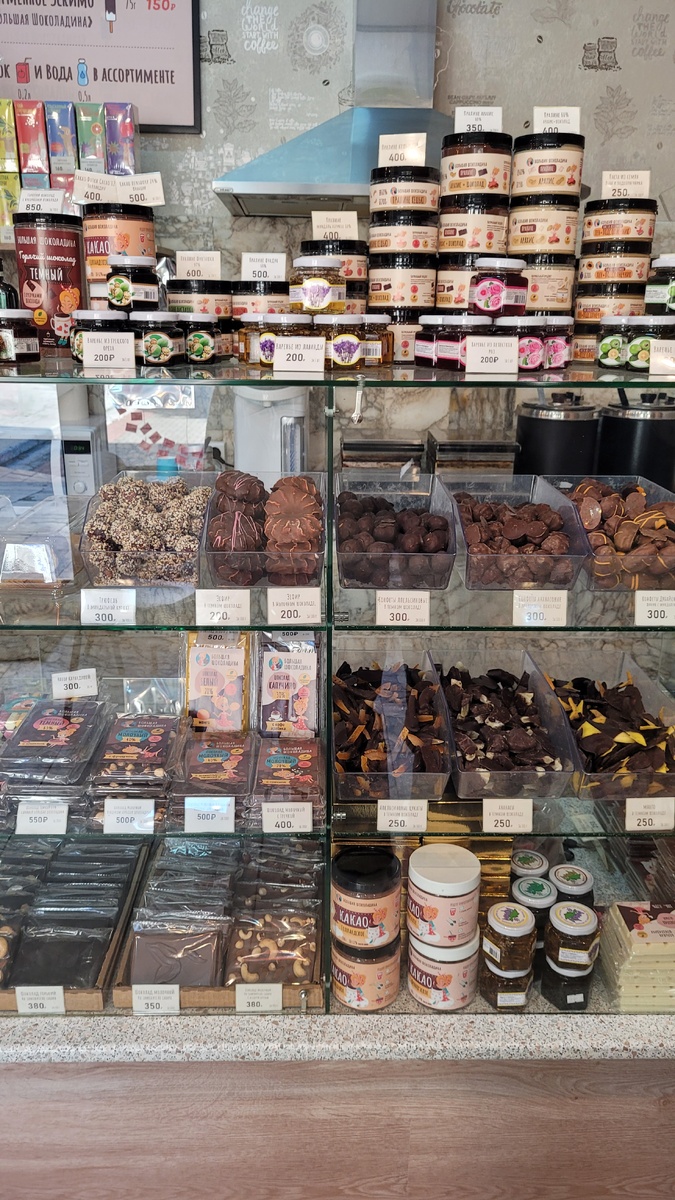 Недавно я посетила милую кондитерскую Большая Шоколадина рядом с бюветом минеральной воды в Горячем Ключе, и была просто в восторге! Это настоящая находка для всех любителей сладостей и ценителей шоколада. Прежде чем выбрать шоколад, вам предложат продегустировать, так как вкусов очень много и все они не обычно вкусные. Еще здесь есть разное варенье, с шишками, с фейхоа и т.д Все шоколадные изделия здесь готовятся вручную из натуральных продуктов. Я попробовала несколько видов шоколада с различными начинками — орехами, фруктами и даже травами! Мой фаворит — шоколад с морской солью и карамелью. Это идеальное сочетание сладкого и солёного заставляет забыть обо всех заботах! Еще понравился со вкусом гречки) Необычно я бы сказала. Шоколад бесподобен, я такого шоколада еще не пробовала, не знаю , что за какао бобы вы используете , но это просто шедевр. Несмотря на небольшое помещение ассортимент продукции довольно значительный, есть подарочный шоколад, турецкий кофе, различный шок