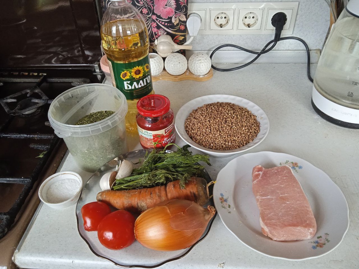 Гречка с овощами и мясом – это питательное и вкусное блюдо, которое можно приготовить по-разному, варьируя виды мяса и овощей. Рецепт 3-4 ст.л растительного масла 250 грамм свинины 350 грамм гречки 1-2 зубчика чеснока 1 крупная луковица 1 средняя морковь 1-2 средних помидора 1 столовая ложка томатной пасты свежая зелень по вкусу (у меня укроп и петрушка) соль 1. Промываем гречку в холодной воде. Оставляем, залитой водой, до отправки в сковороду. 2. На подсолнечном масле обжариваем нарезанные кусочки свинины. 3. К мясу добавляем мелко нарезанный чеснок и лук. Жарим минут 10. 4. Чистим и нарезаем небольшими кубиками морковь и помидоры без кожицы. Добавляем к мясу с луком, жарим минут 10-15. 5. Добавляем к овощам свежую зелень, приправу и 1 столовую ложку томатной пасты, перемешиваем, добавляем немного кипятка, томим минут 10. 6. Сливаем воду с гречки, засыпаем её на сковороду, перемешиваем с мясом и овощами, солим и заливаем кипятком так, чтобы вода покрывала гречку на 1 см.