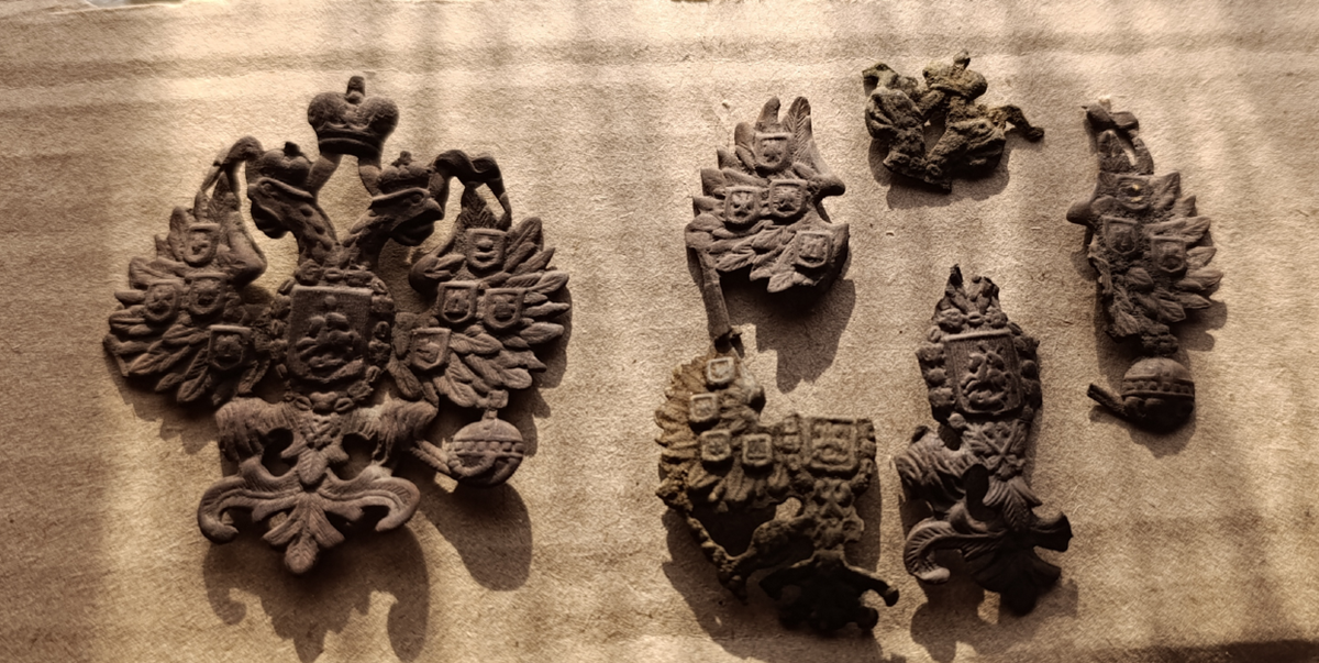Из тех фрагментов, которые есть у меня, можно почти составить еще одну кокарду. Только вот видно, что фрагменты от разных типов орла. Это хорошо видно по расположению "малых гербов" на крыльях.