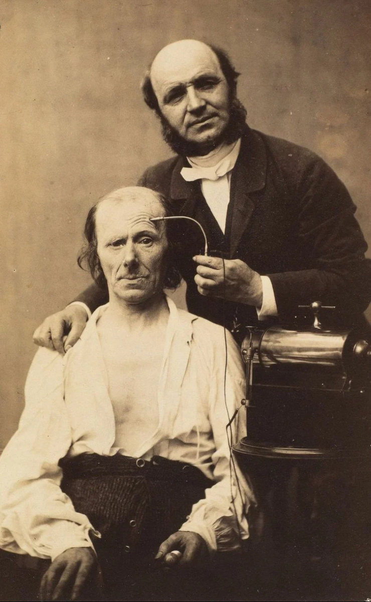 Если вам казалось, что в 19 веке у людей были хобби вроде «падать в обмороки, гулять по Парижу в цилиндре или читать стихи при свечах», то вы, конечно, правы. Но были и другие увлечения. Например, французский врач Гийом-Бенжамен Дюшен де Булонь обожал дергать людей за лицо электрическим током. Причем, разумеется, во имя науки. Доктор Дюшен был пионером физиогномики – науки, изучающей мимику человека. И он очень хотел разобраться, какие именно мышцы отвечают за выражение тех или иных эмоций. Неистовый врач решил, что миру срочно нужна научная книга. А значит, нужно экспериментировать. Тут-то и началось веселье. В лаборатории доктора совершенно случайно оказался генератор электрического тока, электроды и, конечно, добровольцы. Ну, или те, кто оказался под рукой. Например, пациенты психиатрической больницы. Они, судя по всему, не особенно протестовали (а если и протестовали, то об этом история умалчивает). В роли главной звезды экспериментов выступал некий сапожник с выразительными морщ