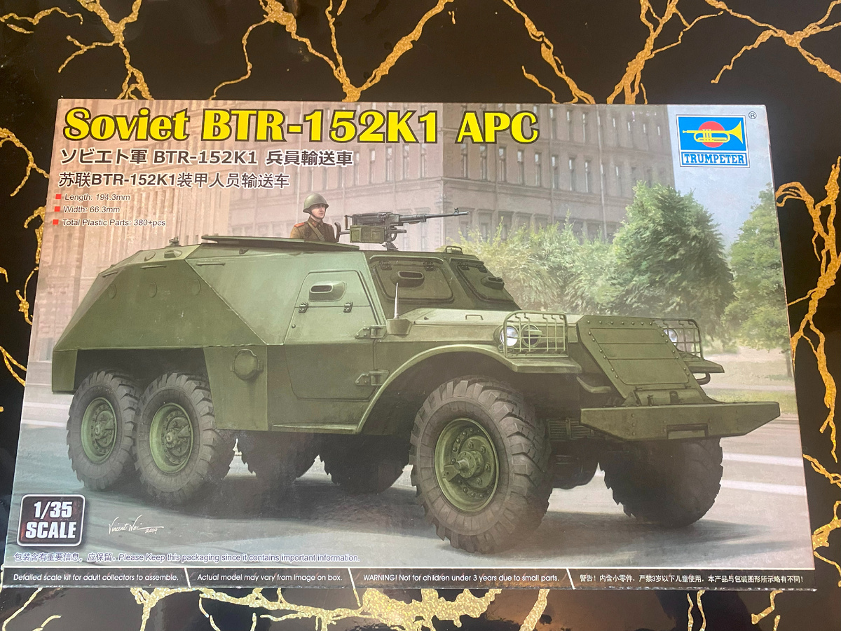 Всем доброго апрельского денечка. Сегодня у нас на канале будет небольшой обзорчик на одну из моделей, имеющихся в моих скромных (не совсем) запасах. Набор этот от фирмы Trumpeter, отношение к которой у нашей публики весьма неоднозначное - кто-то благосклонно относится к этим китайским товарищам за широкий ассортимент моделей различной техники, в том числе и нашей, отечественной, а кто-то ругает на чем свет стоит за их вечные косяки по матчасти, существенные и не очень. Итак, речь у нас сегодня пойдет о модели советского бронетранспортёра БТР-152К1, с броневой крышей корпуса - Soviet BTR-152K1 APC, Trumpeter 09574. Масштаб 1/35.