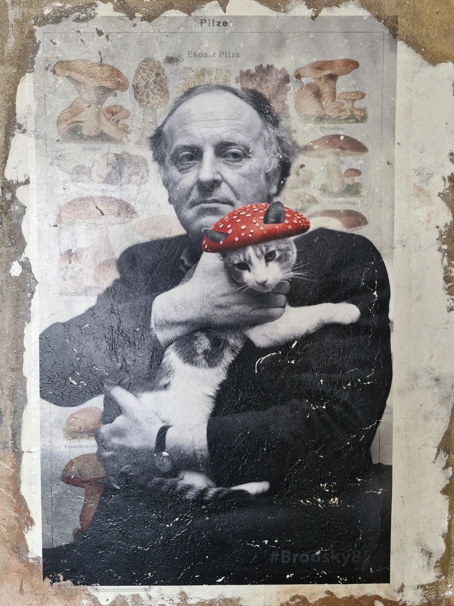 В марте 2025 года в Рязани, во дворе дома №52 по улице Соборной, появился портред Иосифа Бродского. Автор стрит-арта — Олег Лукьянов. Таким образом он начал отмечать 85-летие со дня рождения поэта. В планах «развесить» по миру 85 портретов. Арт-объект прежде всего обратил на сабя внимание за счёт кота в мухоморной шляпке. Но есть еще одна важная особенность: к рязанским муралам, сграффито и пиксель-арту впервые добавилась цифровая фреска (urbanfresco). Это плёнка с изображением, которая приклеивается к стене и становится почти неуязвимой. Часто поклонники стрит-арта считают это недостатком, ведь временность и хрупкость — свойства уличного творчества. Автор цифровой фрески, как Бродский, из Петербурга, но старт памятному проекту дал в Рязани. Почему? Вопросы я задала Олегу Лукьянову, вот коротко, что он ответил. Oлег Лукьянов: «Здесь есть что-то особенное, что перекликается с духом поэзии Иосифа Бродского. Рязань со своим самобытным обликом показалась мне идеальным местом, чтобы начать