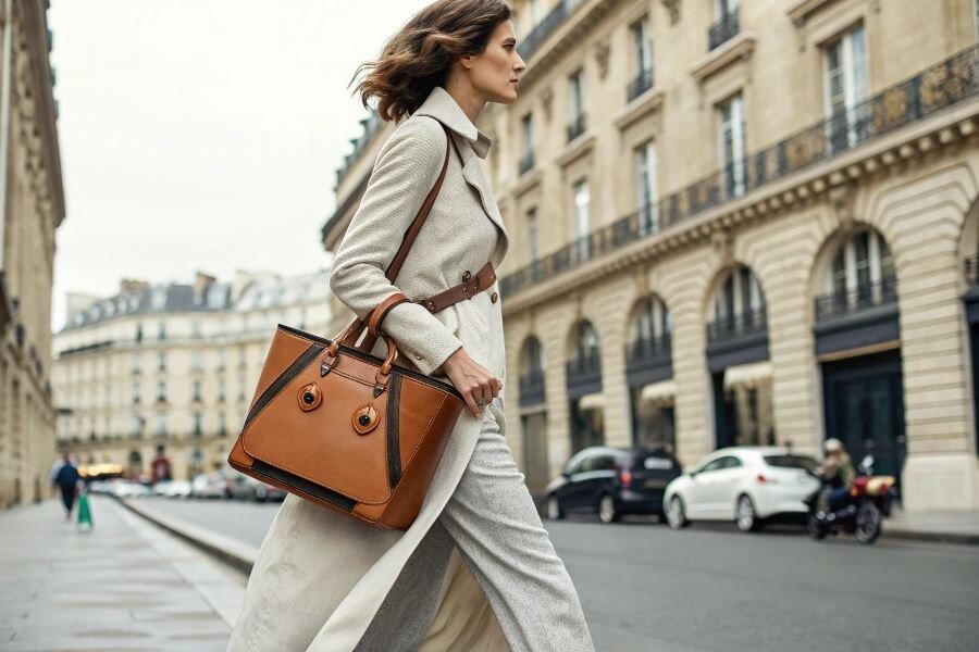 Минималистка оценит бежевую или чёрную сумку. Она дополнит лаконичный образ, базовые вещи. Добавьте минималистские украшения, туфли – образ готов.