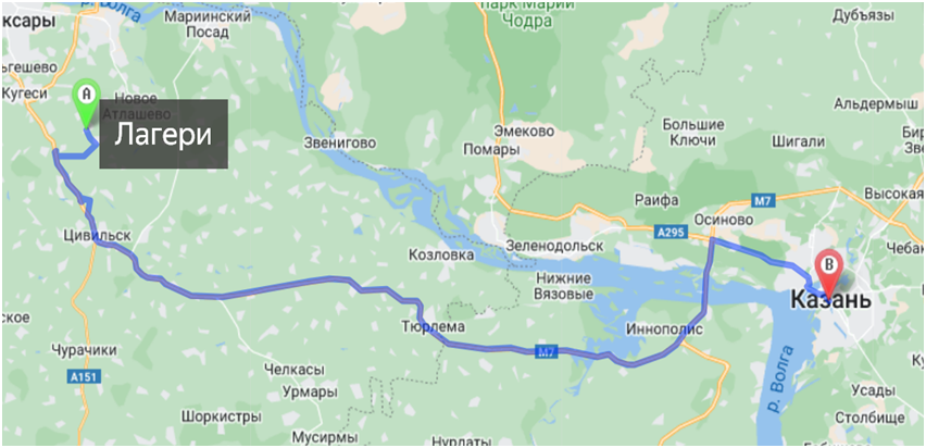 Рис. 1 А - Деревня Лагери Чебоксарского района; B - станция Тихорецкая Горьковской железной дороги (Казань). Расстояние - 150, 98 км. Автотранспорт.