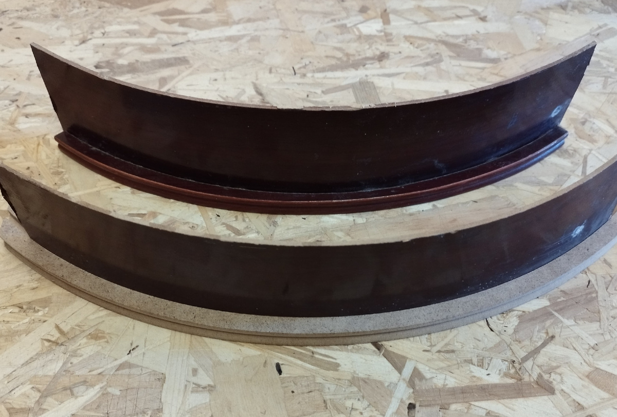 После расчета радиуса (внешнего) нижней обвязки царги стола можно приступить к изготовлению. Используется кромочный фрезер с циркульным приспособлением. С учетом того, что кромка обвязки имеет профиль, а фрезы с таким профилем или частью такого профиля в наличии нет, использую кромочную профильную фрезу, а деталь делаю составной. Просто беру два листа МДФ 6 мм, фрезерую края под радиус, а затем склеиваю между собой получая искомый профиль. Сначала фрезерую внешний радиус (сразу обеих мдф) Затем обрабатываю кромки фигурной фрезой дающей радиусную кромку Радиусы соответствуют радиусам исходника Наношу клей на ширину склейки и накладываю вторую половину сверху. Получаю "бутерброд" толщиной 12 мм. Искомый профиль, максимально близкий к исходному Прямой пазовальной фрезой фрезерую паз под царгу Эту же фрезу использую в качестве отрезной У изготовленной копии наждачным бруском формирую небольшие скругленные фаски вручную, так как радиус скругления очень незначителен и необходимости во фрезер