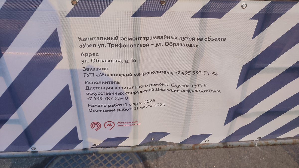 Плакат о ремонте на треугольнике Образцова - Трифоновская. И ни слова о перекрытиях в этом месте.