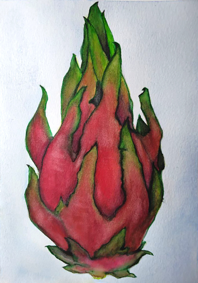 Продолжаю свои опыты. Сегодняшняя зарисовка посвящена удивительному фрукту, в который я просто влюбилась с первого взгляда и укуса, побывав в 2019 году во Вьетнаме. Питайя, питахайя, драгонфрут. Его же называют драконьим сердцем. Экзотика наравне с манго и дурианом. Я хорошо помню нескончаемые плантации в провинции Биньтхуан с кактусами, похожими формой на знакомых каждой хозяйке "декабристов". Только вместо ярко-розовых цветов — ярко-розовые же плоды. Драконий фрукт бывает с белой и свекольно-красной мякотью, напичканной мелкими чёрными семечками. Вкус у него нейтральный, и по этой причине многим нашим соотечественникам он не нравится. Ждали от экзотики сладости, необычного аромата, запоминающихся ощущений для рецепторов, а тут вода водой... Мол, кактус он и есть кактус, что с него взять! А я отношусь к тем, кто данный фрукт просто обожает. Он очень сочный и прекрасно утоляет жажду. Незаменимый в тропическую жару. К слову, в Таиланде довелось попробовать драгонфрут с жёлтой кожицей.