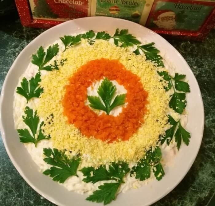 10. Отварную маленькую морковку очищаем, натрем на мелкую терку. Для желтков также используем мелкую терочку. Зелень петрушки помоем и украшаем наш салатик, как на фото.