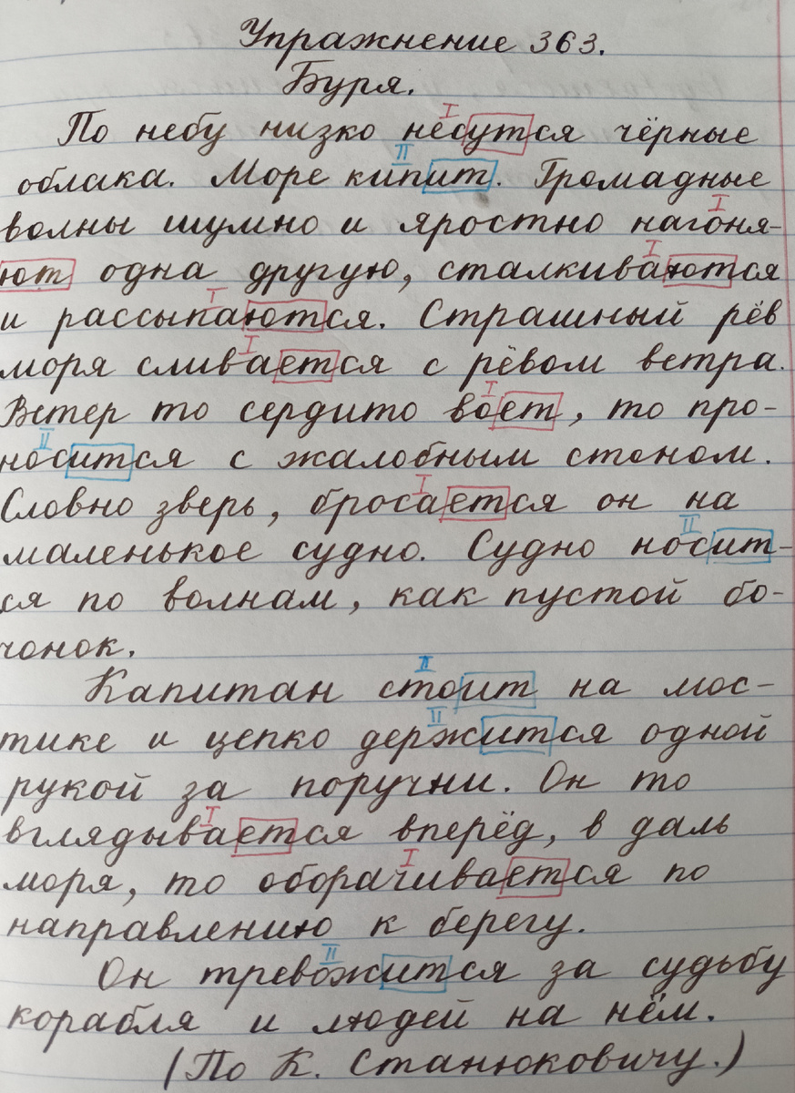 1. Проверка домашнего задания. 2. Объявление темы урока. Сегодня мы будем повторять правописание глаголов с -тся и -ться, а также вспомним правописание существительных и прилагательных. 3. Работа по теме урока. Откройте упр. 363. Прочитайте задание. Перескажите своими словами, что нужно сделать. Прочитаем текст. - Почему он назван "Буря"? Перечитаем текст с карандашом в руках, исправим окончания глаголов прошедшего времени на настоящее: Неслись (прошедшее время) - несутся (настоящее время). Облака (что делают?). В вопросе окончание -ет, значит и глагол пишется без мягкого знака. И так далее проговаривается каждый глагол. Теперь докажем окончания существительных: (С) рёв... - рёв, 2 склонение, заменяем словами-помощниками "конь, окно": с конём, с окном. Пишем окончание -ом. (С) стон... - стон, 2 склонение, заменяем словами-помощниками. Пишем окончание -ом. (На) мостик... - мостик, 2 склонение, заменяем словами-помощниками: на коне, на окне. Пишем окончание -е. Теперь докажем окончания п
