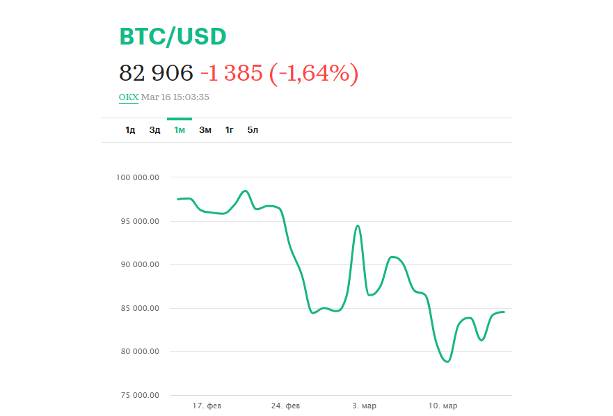 - 11 марта ситуация на рынке криптовалют улучшилась — пара BTC/USDt выросла на 5,52%, до $82 932, с максимумом $83617 на американской сессии. Отскок составил 9,3% от минимума $76 606.