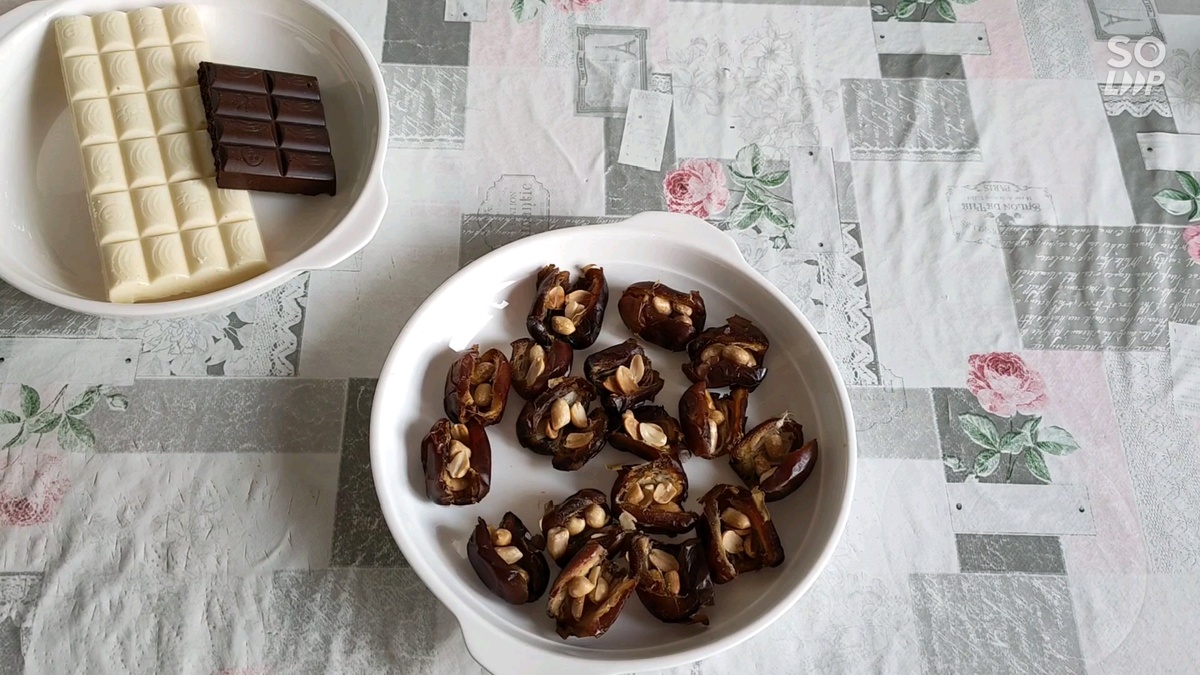 Нежный шоколадный слой в сочетании с карамельной текстурой фиников и легкой ореховой начинкой создают настоящий гастрономический шедевр. Понадобится: 15-20 фиников без косточек, 1 плитка белого шоколада, 1/3 плитки тёмного шоколада, 20 грамм орехов. В каждый финик положить немного орехов Закрыть финики Белый шоколад переложить в металлическую посуду, а тёмный в кондитерский мешок Растопить белый шоколад на водяной бане Окунуть финики, переложить на пергаментную бумагу и убрать в морозилку Тёмный шоколад опустить в горячую воду После того как растает, срезать очень маленький уголок у кондитерского мешка Достать финики и украсить темным шоколадом Подержать в морозилке 5-10 минут и подавать Подробнее на видео Источник: канал "4етыре ложки" на YouTube