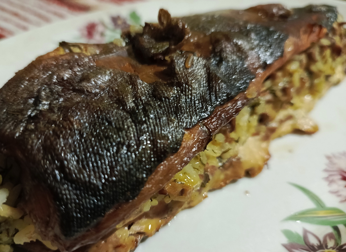 Берем одну рыбку горбушу, режем ее вдоль, вынимаем хребет и мелкие кости. Начинка: нарезаем шампиньоны и лук, обжариваем их на сковороде, выкладываем в блюдо. Добавляем тертый сыр, немного вареного риса и нарезанную петрушку. Все перемешиваем Блюдо для запекания застилаем фольгой. Выкладываем одну половину рыбы кожей вниз. Солим, перчим, выкладываем начинку. Сверху выкладываем вторую половину рыбы. Все закрываем фольгой и ставим в духовку до готовности. За 10 минут, открываем фольгу, чтобы появилась хрустящая корочка.