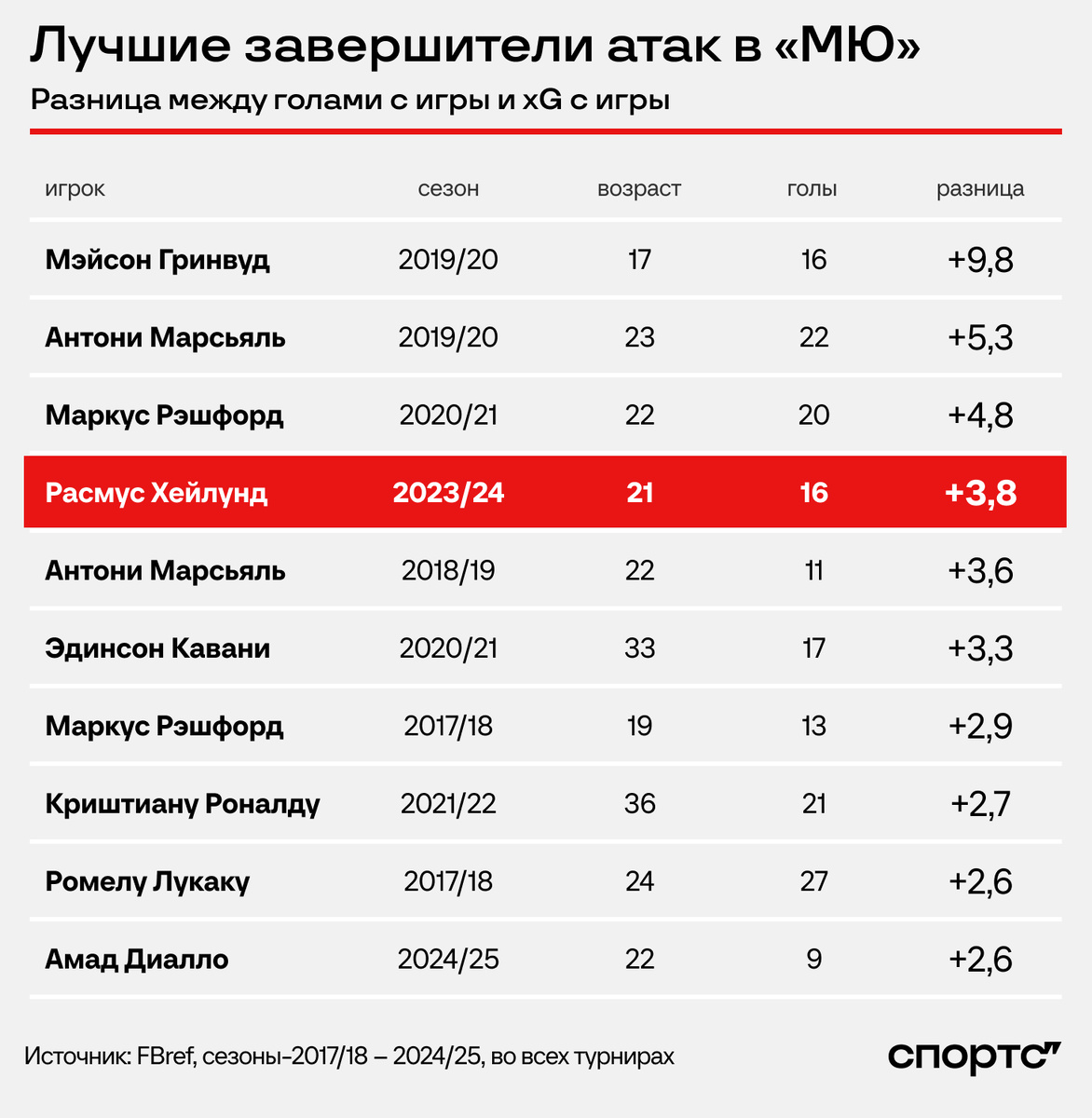 Проговорим забытое: Расмус Хейлунд – хороший финишер. Дебютный сезон датчанина в «Юнайтед» входит в список лучших по реализации за последние восемь лет.