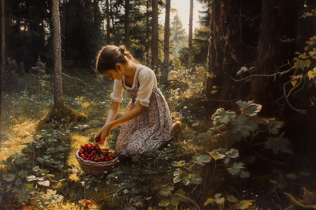 Он пошёл на звук и вскоре увидел её на маленькой поляне. Она сидела на корточках, собирая землянику прямо в ладони, и, кажется, тихонько напевала что-то знакомое.