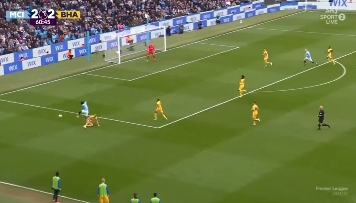 «Манчестер Сити» дома сыграл вничью с «Брайтоном» (2:2) в 29-м туре АПЛ. На 61-й минуте вингер «горожан» Доку получил от судьи Саймона Хупера желтую карточку за симуляцию после подката защитника Жан-Поля ван Хекке возле штрафной «Брайтона». Главный тренер «Сити» Гвардиола после матча высказывал претензии арбитру. «Если бы он не прыгнул, он мог бы сломать ногу. Соперник идет в подкат, и Жереми прыгает, чтобы избежать контакта. Доку – не ныряющий игрок. Они [судьи] должны знать это, но что есть, то есть. Мы не выиграли и не проиграли из-за этого решения. Я сказал судье: «Если бы он не прыгнул, его бы сильно пнули по ноге». Доку прыгнул, чтобы защитить себя, но это не имеет значения, не спрашивайте меня об этом», – заявил Пеп. Изображение: кадр из трансляции Sky Sport 2
