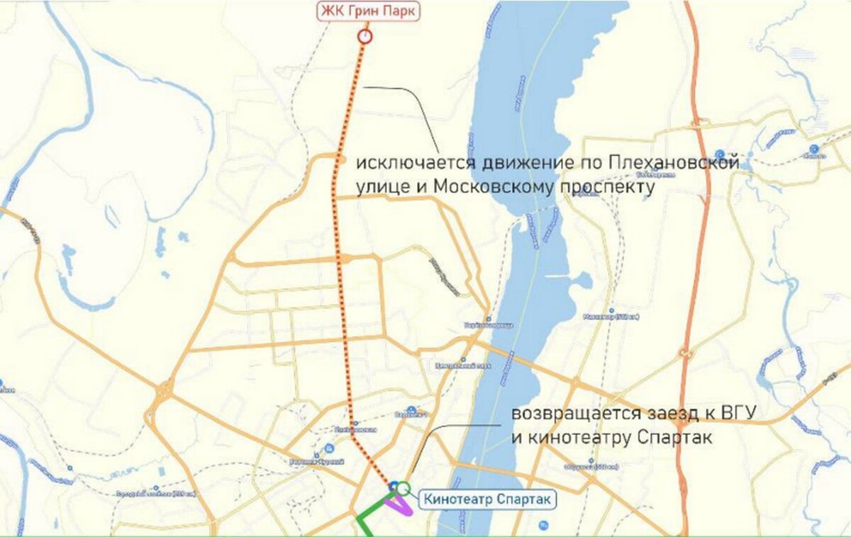 С понедельника автобусы перестанут двигаться по улице Плехановской, Московскому проспекту и в ЖК "Грин Парк". Они будут направлены с улицы Кирова через ВГУ до кинотеатра «Спартак» и в обратном направлении.