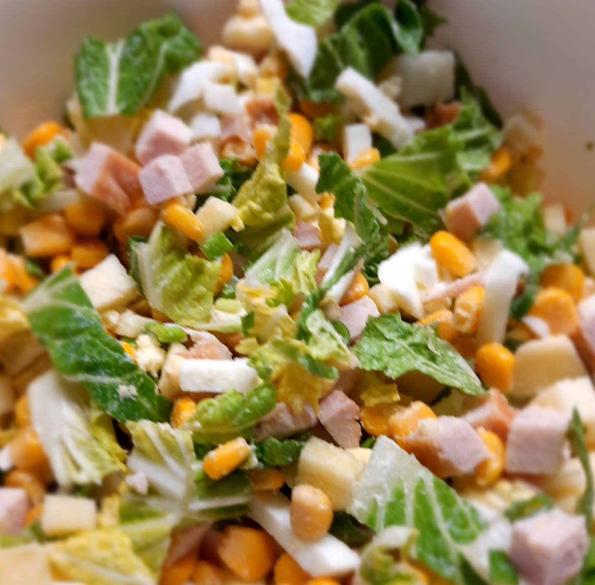 Ингредиенты: пекинская капуста (щедрая горсть) 1 банка сладкой кукурузы 3 варёных яйца 1 куриная грудка (варёная или копчёная) 2 яблока зелёный лук Пекинскую капусту и яйца порезать Добавить порезанную куриную грудку и яблоки, добавить банку кукурузы и зелёный лук Всё перемешать. Перед подачей добавить майонез или сметану.