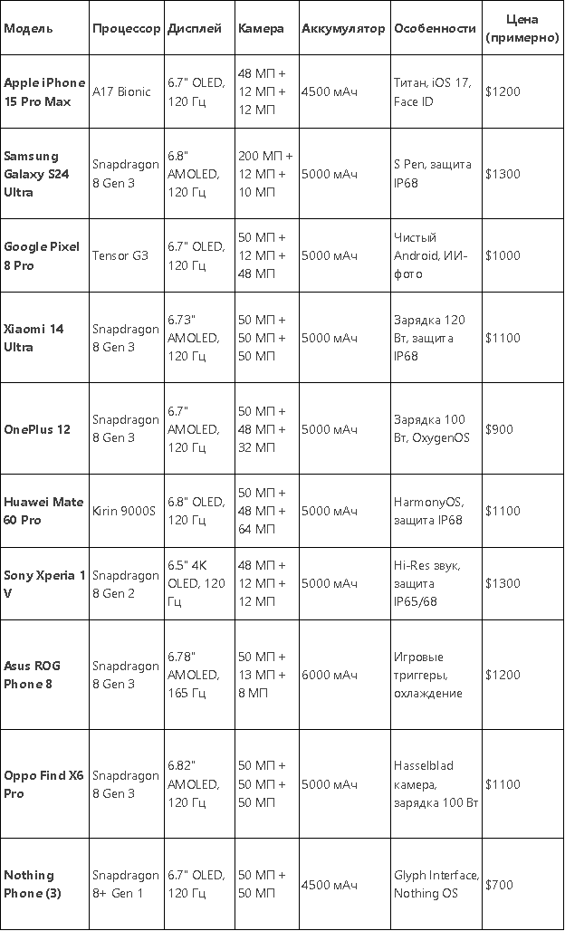 Смартфоны в 2024 году стали еще мощнее, стильнее и функциональнее. Производители продолжают удивлять нас новыми технологиями, улучшенными камерами и долгой автономностью. В этой статье я расскажу о лучших смартфонах 2024 года и представлю их основные характеристики в удобной таблице, чтобы вам было проще выбрать подходящий девайс. 2. Samsung Galaxy S24 Ultra 3. Google Pixel 8 Pro 4. Xiaomi 14 Ultra 2024 год принес множество интересных новинок на рынок смартфонов. Независимо от того, ищете ли вы топовый флагман или доступное устройство с хорошими характеристиками, вы найдете что-то подходящее. Главное — определиться с вашими потребностями и бюджетом. А какой смартфон из рейтинга понравился вам больше всего? Делитесь в комментариях!