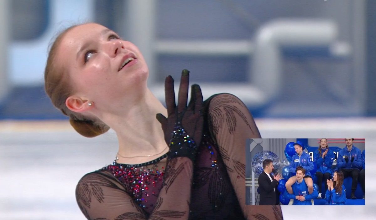 Наши юные и взрослые спортсменки сегодня отдувались не только за себя, за команды, но и за мужчин. Уж очень много наошибались фигуристы в своих ПП, зато девушки сегодня практически все как на подбор. Очень радостно за Дарью Садкову, она чистейше прокатала свою произвольную программу с двумя четверными тулупами и крайне жаль, обидно за Ксению Гущину: спортсменка без ультра-си сегодня наошибалась едва ли не больше всех. Но даже при таком прокате (все-таки Николай Угожаев тоже не блистал мягко говоря), неожиданно было услышать от капитана "красных" Алины Загитовой такие слова в адрес Ксении Гущиной: «Давай-давай, до конца, блин. Че ты ленивая такая? Я не понял!» Думаю, была в шоке вся команда, но выцепить удалось лишь реакцию Александры Бойковой: Что уж говорить, красноречивый поворот головы и отстранение телом. Алина Загитова была необычайно зла во время практически всего проката Ксении Гущиной. Сразу же после первого падения спортсменки, но особо ее похоже убил каскад 2 Риттбергер-2