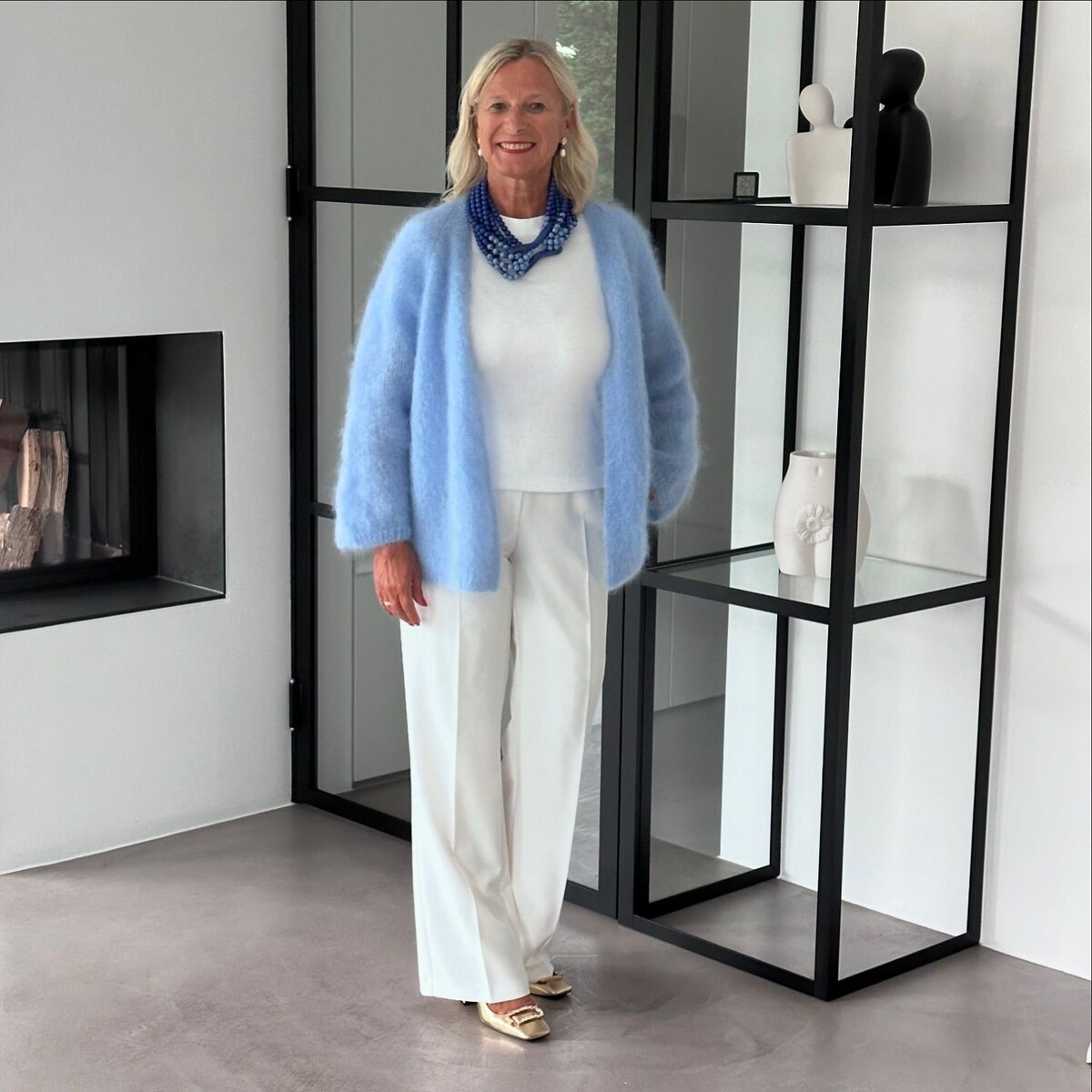 Комби пушистой фактуры и небесно-голубого оттенка – само очарование! Соедините освежающий кардиган с белым лонгсливом и брюками. Детали: туфли, многослойные бусы.