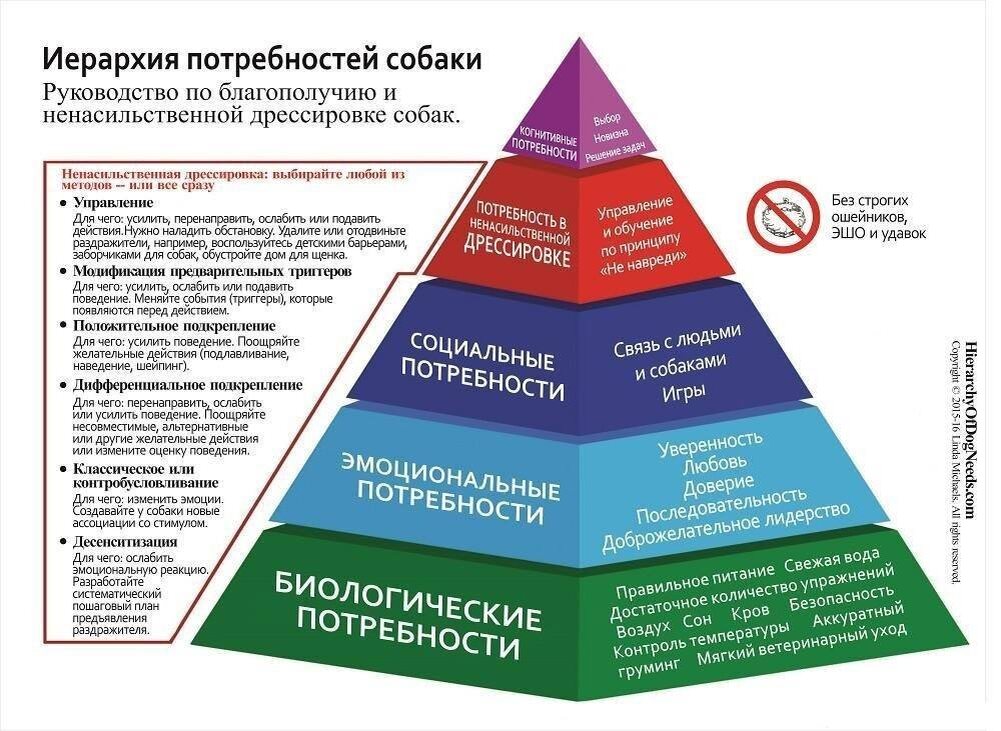 Все вы знаете о пирамиде Маслоу, которая описывает иерархию человеческих потребностей. Такая же пирамида есть у собак. И поскольку собаки полностью зависят от нас, своих людей, мы должны дать им всё, чтобы они чувствовали себя хорошо и в безопасности. Кроме этого существует концепция «Пяти свобод», которая включена во Всемирную декларацию благосостояния животных, содержащихся в неволе (собаки, кошки, лошади, коровы и тд). 5 свобод — это необходимый МИНИМУМ того, что мы обязаны сделать для своих животных. При несоблюдении даже одного пункта, животное считается неблагополучным! Это значит, что у собаки всегда должна быть в постоянном доступе чистая питьевая вода. Корм должен быть качественный, сбалансированный, а порция правильно рассчитана индивидуально под собаку. Режим кормления должен соответствовать возрасту (щенки должны есть по 5-6 раз в день, взрослая собака 2-3 раза). У собаки должно быть собственное место (а лучше несколько) для отдыха, где её никто не будет беспокоить. Темпера