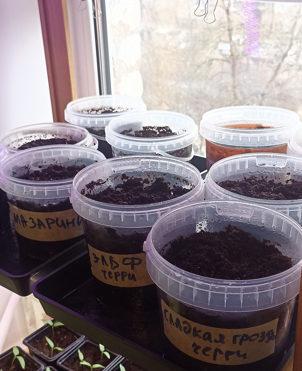 Сегодня поделимся с Вами нашим методом посадки семян томатов на рассаду. Этот метод мы применяем и для других семян, например, сладкого перца, лука порея и других культур. Это не что-то невероятно новаторское, но это то, что работает! Вдруг кому-то будет полезной эта статья. Если у вас есть свои особенные приемы в посадке рассады, поделитесь в комментариях! Замачиваем семена перед высадкой в грунт. Для этого потребуются маленькие контейнеры. Специально они не покупаются, остаются от кетчупов, соусов, васаби, имбиря, которые привозят при заказе пиццы и суши на дом. подойдут любые подобные емкости, пластиковые или стеклянные. Разводим в 1 литре воды одну столовую ложку перекиси водорода. Этот раствор не только увлажнит семена, но и обеззаразит их от возможных бактерий. на дно контейнер укладываем спонж (ватный диск) обильно смачиваем его полученным раствором и укрываем вторым обильно смоченным диском. Так поступаем со всеми сортами. Подписываем контейнеры, чтобы не перепутать где каки