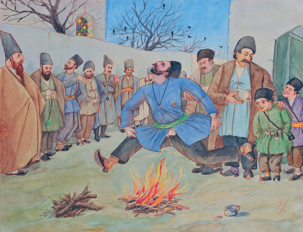 На своей акварели Азим Азимзаде запечатлел мужчину в небогатой одежде, бесстрашно и даже с каким-то восторгом прыгающего через костер. За ним наблюдают жители Старого города: справа – беднота, слева – судя по одежде, «чистая публика». Дети не прочь присоединиться к праздничной забаве, а выражение лиц чванливых господ – надменно-равнодушное – говорит о том, что уж они-то себе подобных развлечений точно не позволят.