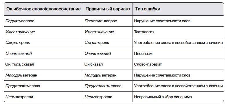 - Нарушение лексической сочетаемости слов (неправильное сочетание слов друг с другом).