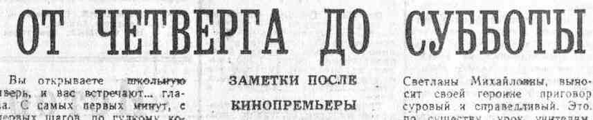 Медленно, но верно продвигаясь в многолетнем деле изучения сканов областной печати на предмет упоминаний о родном городе и попутных интересностей, я добрался до октября 1968 года, где в первых же числах обнаружил сообщение о премьере нетленки Станислава Ростоцкого "Доживём до понедельника". Та до сих пор вызывает живую реакцию публики, что выражается в изрядном количестве комментариев на форумах и в блогах - в том числе по поводу отзывов, когда-то считавшихся невозможными. Я про моду идти вразрез с гуманистическим посылом подобных фильмов. И хоть представленная ниже публикация от 16 октября 1968 года и близко в этом не замечена, зато из неё выяснилось, что, некогда были те, кто высказывал опасения, можно ли столь неоднозначную картину показывать школьникам...