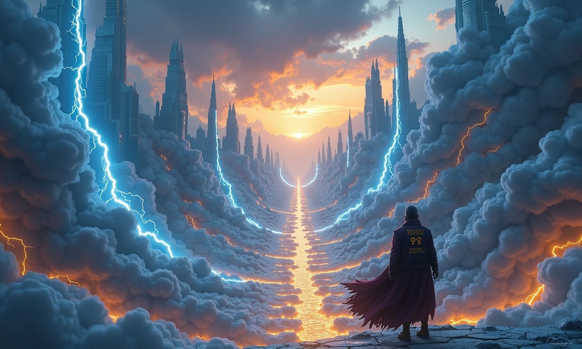 Арран Донн стоял на краю крыши, глядя на город Лумис, раскинувшийся под ним. Улицы, словно застывшие молнии, пересекали город в причудливых узорах, а дома, сотканные из облаков, парили в воздухе, поддерживаемые невидимыми силами. Вдалеке громыхало, и небо окрашивалось в оттенки фиолетового и зеленого — признак приближающейся грозы.