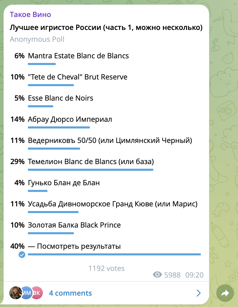 - Результаты голосования, которое мы провели у себя в телеграм-канале https://t.me/takoe_vino